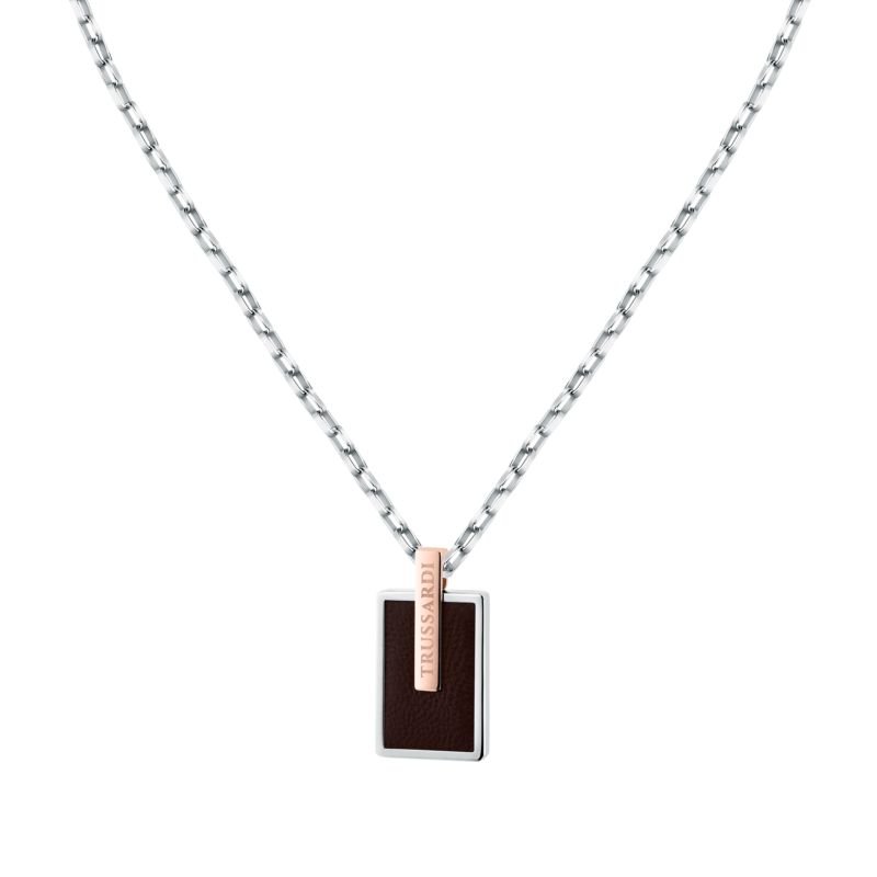 Ανδρικό κολιέ Trussardi από ατσάλι με μενταγιόν σε συνδυασμό καφέ δέρματος και ροζ χρυσού τόνου. Μοντέρνος σχεδιασμός για κομψές και δυναμικές εμφανίσεις.
