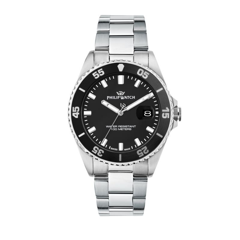 Ανδρικό ρολόι Philip Watch με κάσα και μπρασελέ από ανοξείδωτο ατσάλι και μαύρο καντράν. Διαθέτει ημερομηνία στο 3, φωσφορίζοντες δείκτες και ενδείξεις για μέγιστη ευκρίνεια. Ανθεκτικό στο νερό έως 100 μέτρα, με Swiss Made μηχανισμό, συνδυάζει σπορ δυναμισμό και διαχρονική κομψότητα.