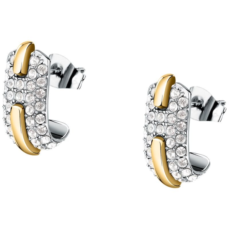 Γυναικεία σκουλαρίκια Trussardi σε ασημί τόνο με χρυσές λεπτομέρειες και επένδυση από λαμπερές λευκές πέτρες. Εντυπωσιακά και πολυτελή, αποτελούν ιδανική επιλογή για βραδινές εμφανίσεις ή για να προσθέσουν λάμψη στην καθημερινότητά σας.